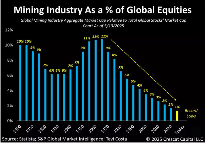 Fact 2: Looking at total equities relative to mining equities, its never been this distorted, meaning soon it will revert to mean of 9 or 10 from 1, a 10X move to upside