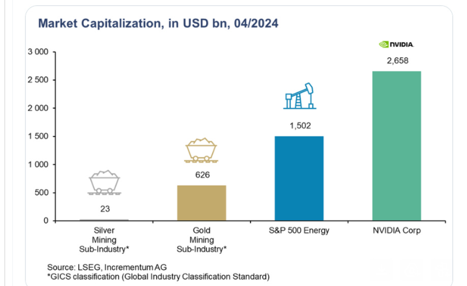 Fact 3: Look how over-valued SP 500 (flagship Nvidia almost 2.7 trillion) whereas all silver miners together only 23 Billion. As retail and institutional money starts rotating out of over-valued into safe plays, the impact on the tiny silver market is ENORMOUS. Some of our endorsements will pop 5 x (in short time horizon) up to 50 x (long term)