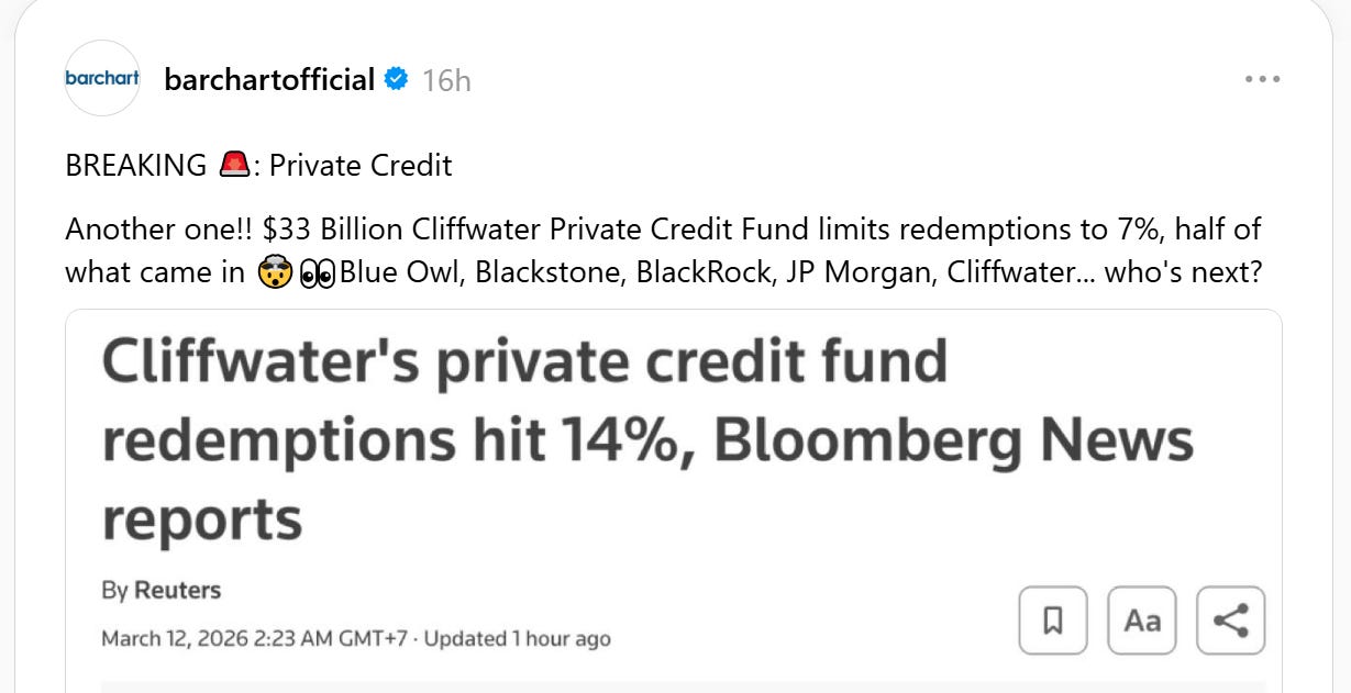 A thirty-three billion dollar private credit fund just told its investors, in plain language: “You can’t have your money back.” Cliffwater capped redemptions at 7% when investors asked for 14%. Half got out. Half got locked in. Morgan Stanley is restricting redemptions. JPMorgan is restricting private credit lending. These are not fringe players. These are the gatekeepers of the system — and they are quietly closing the doors.