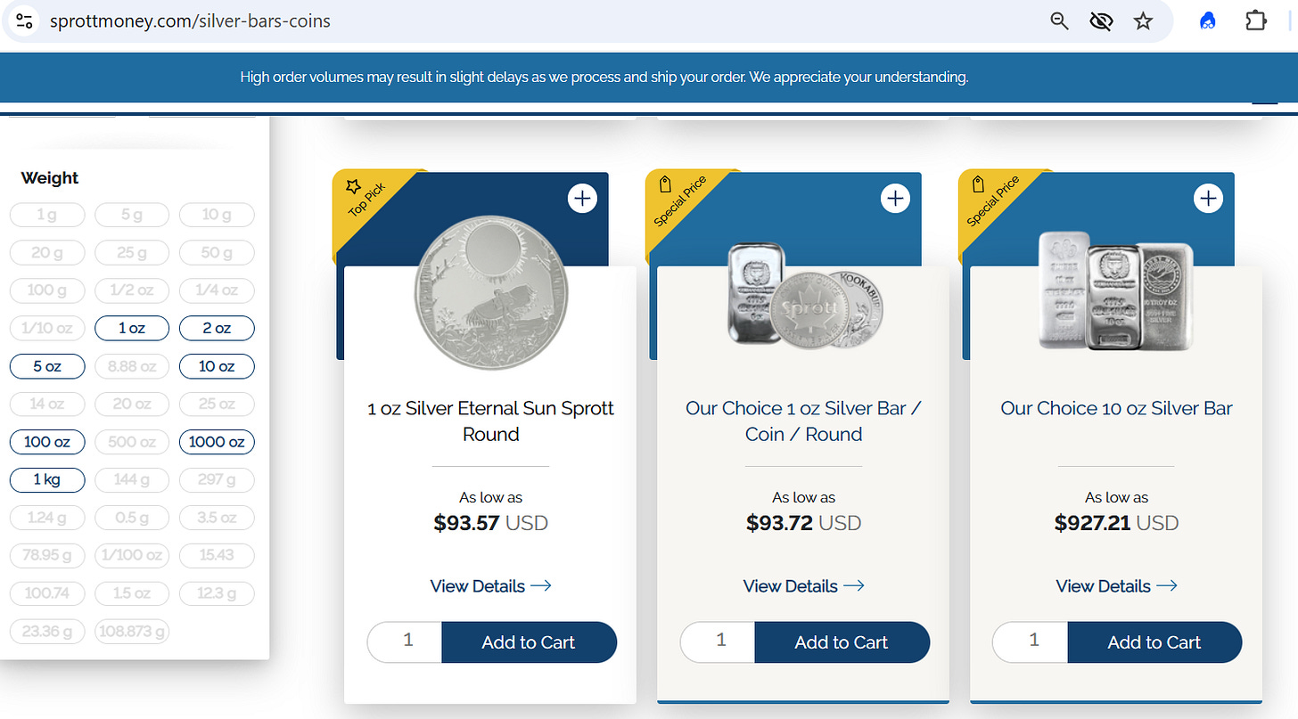SprottMoney.com is one of the most trusted names in physical bullion, offering investment‑grade gold and silver from top global mints with insured, discreet delivery and secure storage options. In a market where spot silver has exploded, they are still listing products around the low 90‑dollar range, giving investors a rare chance to secure real metal in size while inventory remains available and pricing is only just catching up to the new reality.