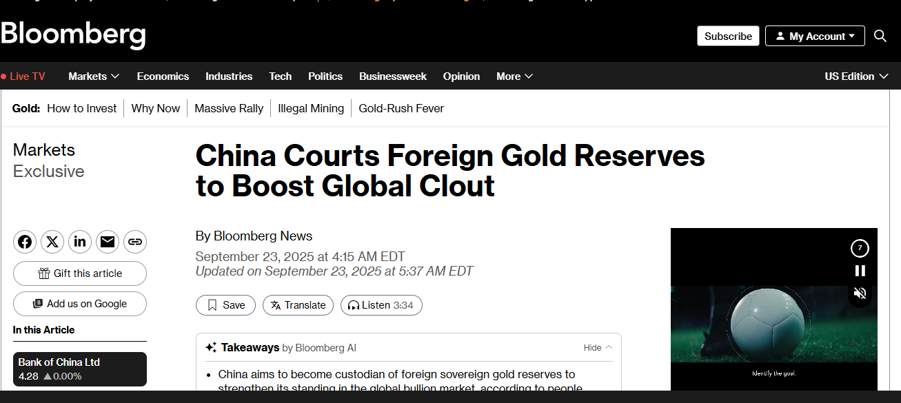 China’s central bank, the People’s Bank of China (PBOC), has been on a gold-buying spree for ten consecutive months, swelling reserves to record levels. But Beijing’s quiet masterstroke is now coming into full view: it is not simply stockpiling precious metal—it is inviting foreign central banks to park their national gold reserves inside China itself. Bloomberg reports that the PBOC is actively courting friendly states, urging them to buy bullion and store it in domestic vaults managed by the SGE. At least one Southeast Asian nation has reportedly shown interest, and more are expected to follow.