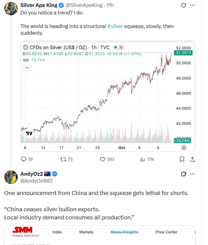 Silver’s historic 2025 rally has pushed London spot to over $51/oz, triggering global chaos for short positions as physical supply in the West reaches crisis levels. Now, market insiders warn that just one move from China could decisively escalate the squeeze: a formal halt to silver bullion exports. For decades, China’s processing trade and modest export quotas have supplied critical flows to Western markets. Any sign that Chinese authorities are freezing or even severely slowing general silver exports—diverting all domestic refined production to meet local solar, electronics, and industrial demand—could render the London short squeeze catastrophic for global shorts.