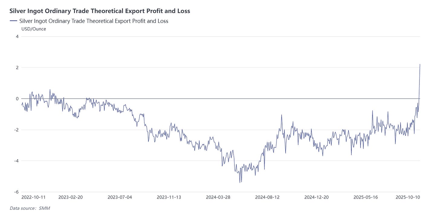On October 9, the spot price of silver in London broke through the key level of $50 per ounce, reaching a high of $51.2230 per ounce, setting a new record high since 1980. Additionally, the LBMA spot prices against COMEX futures saw an unusual premium expansion to over $2.50 (typically just a few cents), creating a rare dislocation between futures and spot markets overseas along with a backwardation structure. In response, the Chicago Mercantile Exchange raised margin requirements for silver and gold futures. In contrast, domestic silver prices performed relatively weakly on October 9 and 10, with silver ingot exports becoming profitable……