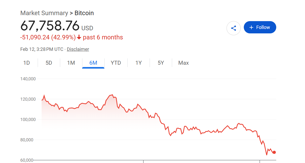 In the past six months, Bitcoin has plunged from 120,000 to 67,000—a 43% drawdown in what was supposed to be the apex “store of value.”