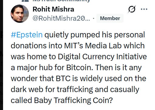 In light of the Epstein files, the immaculate myth of Bitcoin is starting to look like a crime scene, not a creation story. We are discovering that what was sold as a stateless, grassroots revolt against central banking may have been incubated in the same elite petri dish that sheltered Jeffrey Epstein—intertwining MIT, tainted money, and influence over core developers. Strip away the techno-utopian branding, and Bitcoin begins to resemble the unofficial house currency of a compromised network of power, a financial rail emerging from the very circles that built and protected a global blackmail empire. This isn’t just a story about code; it’s a story about who paid for the coders, and what kind of world they were really programming us into.