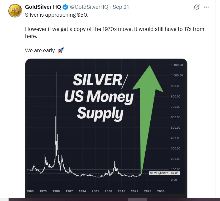 If silver repeats its explosive 1970s trajectory after adjusting for today’s ballooning money supply, the metal is poised for a jaw-dropping 17x surge— history’s greatest catch-up trade. Jump in!