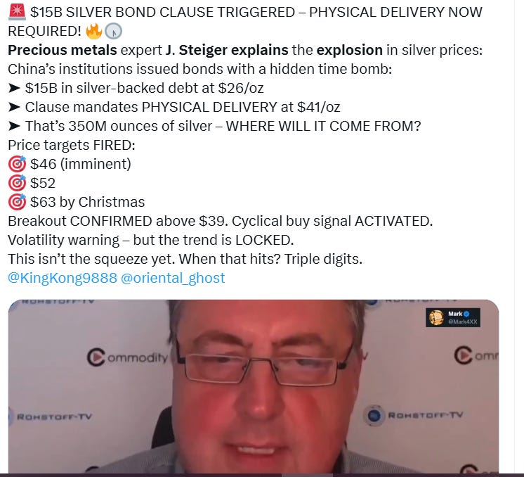 The most dramatic development, however, has emerged in China. Precious metals expert J. Steiger revealed that a series of Chinese corporate bonds issued in recent years contained a hidden clause tied to the silver price. These bonds, worth $15 billion when first issued, were backed by silver at $26 per ounce. But buried within the fine print was a stipulation: if silver rose above $41, issuers would be required to settle not in cash but through actual physical delivery. With the price now piercing that threshold, the market is suddenly staring down the forced delivery of an estimated 350 million ounces of silver. For a metal already in structural deficit for multiple years, the implications are staggering.