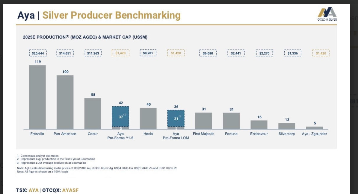 Aya Gold & Silver looks dramatically undervalued versus Coeur, Hecla, and First Majestic on a “market cap per ounce produced” basis using 2025 production and market cap figures. Understanding that some companies’ figures are inferred, while others are reported under customary, standard disclosure practices.