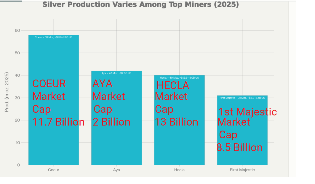 First Majestic produces 31 Moz with an ~$8.2–8.5B market cap, or about 3.6–3.8 Moz per $1B, so Aya delivers about 5.5–6x the ounces per $1B of market cap compared with First Majestic.