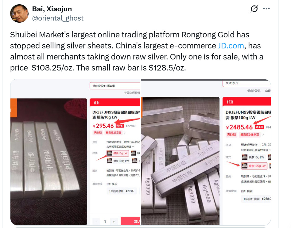The world’s supply of physical silver has entered crisis mode. Silver sheets—once a standard offering from China’s largest trading platforms—have abruptly disappeared. Rongtong Gold, the leading online retailer at Shuibei Market, has frozen all silver sheet sales, making bulk purchases impossible for wholesalers and industrial users. At the consumer level, JD.com, China’s dominant e-commerce hub, shows nearly all merchants have delisted raw silver bars. Only a lone seller remains, demanding $108.25 per ounce and an eye-watering $128.50 per ounce for a small raw bar—prices that starkly outpace global spot rates by more than 100%.